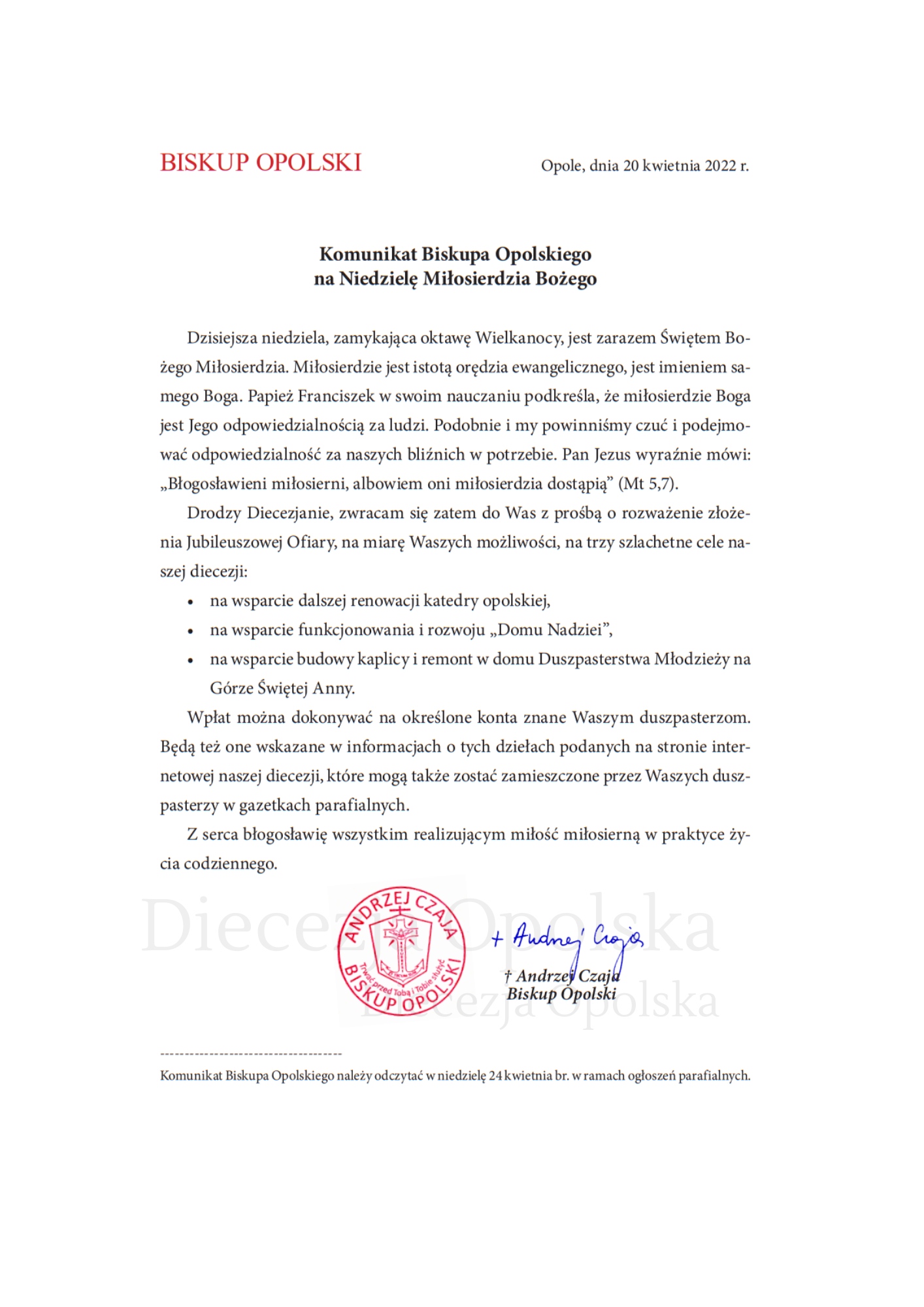 W tytule wpłaty: Darowizna na cele kultu religijnego – renowacja Katedry Opolskiej