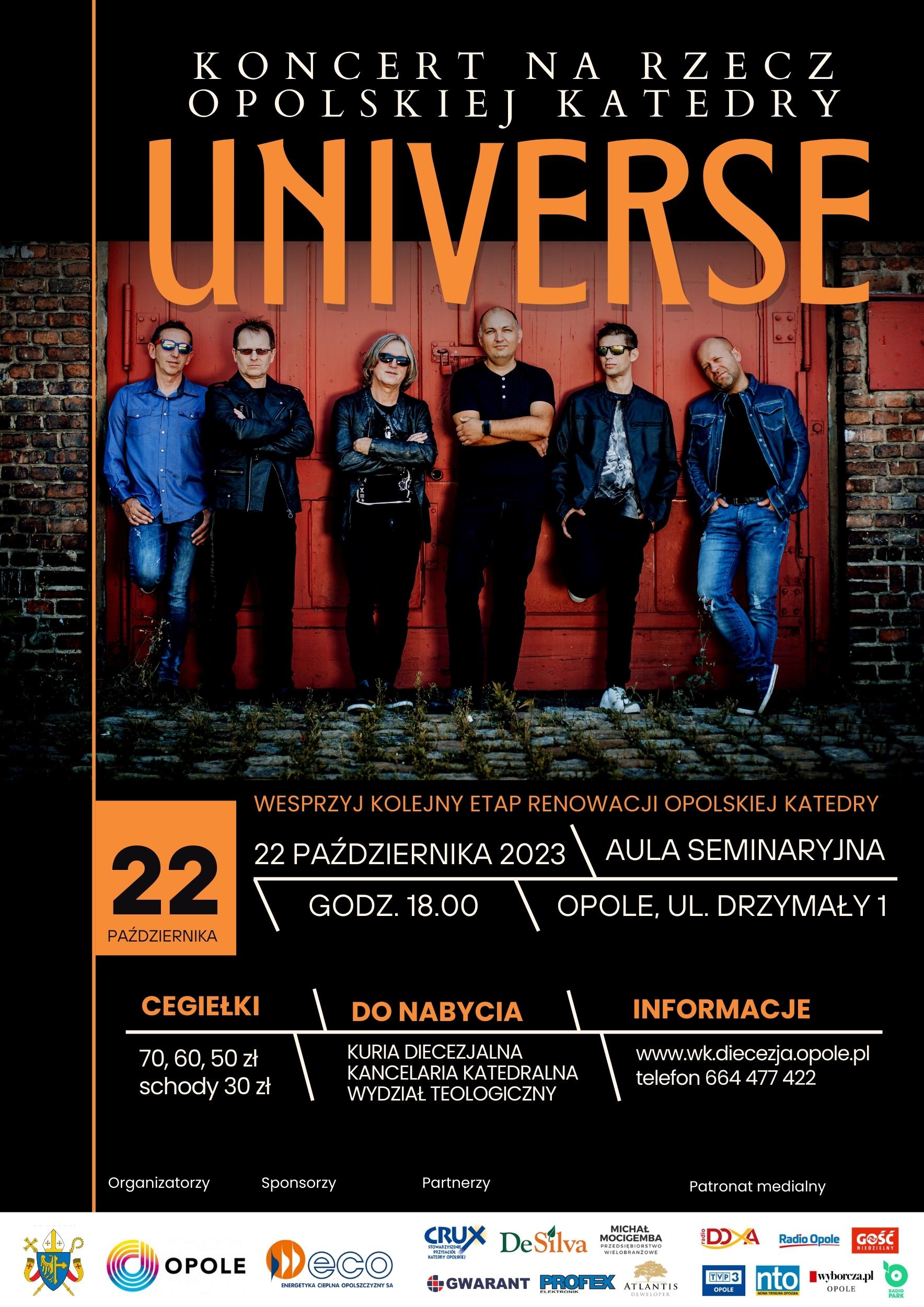 W niedzielę 22 października 2023 r. w auli seminaryjno-wydziałowej w Opolu (ul. Drzymały 1) odbędzie się koncert zespołu Universe. Koncert rozpocznie się o godz. 18.00. Bilety-cegiełki w cenie 50, 60, 70 zł nabyć można na portierni Wydziału Teologicznego Uniwersytetu Opolskiego, w kancelarii parafii katedralnej, na furcie Kurii Diecezji Opolskiej. Całkowity dochód zostanie przeznaczony na renowację opolskiej katedry. Szczegółowe informacje na stronie internetowej.