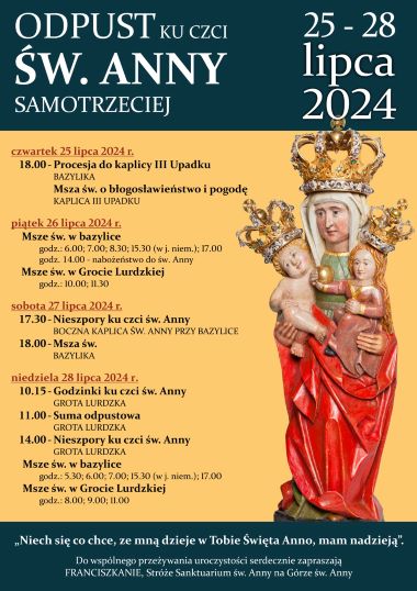 Ojcowie Franciszkanie z Góry Świętej Anny w dniach 25-28 lipca br. zapraszają do udziału w dorocznym odpuście ku czci św. Anny.