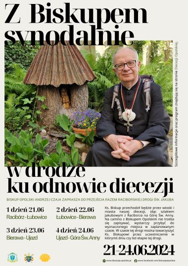 Biskup Opolski przechodził będzie przez wioski i miasta naszej diecezji idąc szlakiem Jakubowym z Raciborza na Górę św. Anny. Na camino z Biskupem nie trzeba się zapisywać, wystarczy przybyć do wyznaczonego miejsca w zaplanowanym czasie. W czasie tej drogi można towarzyszyć Ks. Biskupowi, przez uczestniczenie w jakimś dniu czy też etapie tej drogi. Istnieje również możliwość indywidualnego zorganizowania sobie noclegu na trasie. Więcej informacji na stronie raciborskiej drogi św. Jakuba https://camino.net.pl/droga-w-polsce/droga-raciborska/