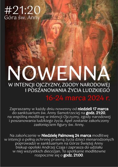 Organizatorzy Nowenny w intencji Ojczyzny, zgody narodowej i poszanowania ludzkiego życia zaprosili do przewodniczenia tej modlitwie przedstawicieli Episkopatu Polski, którzy wraz ze swymi diecezjanami podejmą ją w ważnych miejscach diecezji, z których ponadto prowadzona będzie transmisja on-line. Nasz biskup Andrzej Czaja poprowadzi modlitwę nowenny w ostatni dzień jej trwania – w Niedzielę Palmową 24 marca br. – w Sanktuarium św. Anny na Górze Świętej Anny. Biskup opolski Andrzej Czaja zaprasza wszystkich diecezjan do przyjazdu na Górę Świętej Anny na wspólną modlitwę, która będzie transmitowana dla wszystkich rodaków. Spotkanie modlitewne rozpocznie się o godz. 21.00. W programie: Apel Jasnogórski, dziesiątek Różańca, słowo Księdza Biskupa oraz modlitwy związane z nowenną. Transmisja tej modlitwy, dzięki współpracy z Diecezjalnym Radiem Doxa, będzie dostępna na kanale YouTube diecezjalnej rozgłośni.