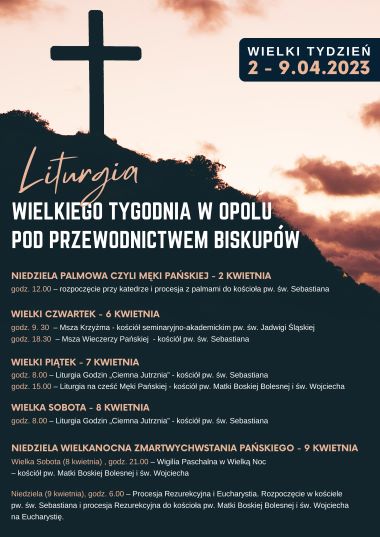 Tegoroczne celebracje Wielkiego Tygodnia pod przewodnictwem naszych Biskupów, z uwagi na remont kościoła katedralnego, będą sprawowane w kościele seminaryjno-akademickim pw. św. Jadwigi Śląskiej, kościele rektorskim pw. św. Sebastiana oraz kościele parafialnym pw. Matki Bożej Bolesnej i św. Wojciecha w Opolu. Księża Biskupi serdecznie zapraszają do wspólnego przeżywania misterium męki, śmierci i zmartwychwstania Chrystusa.