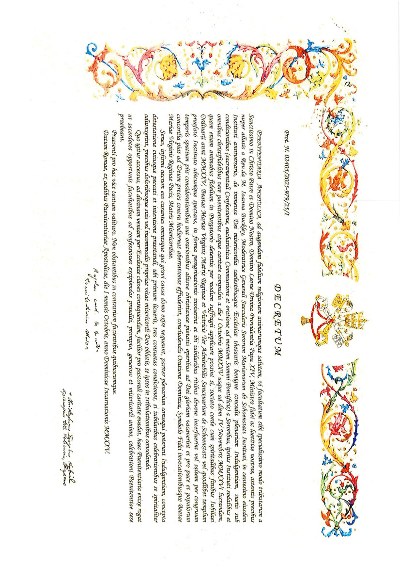 Penitencjaria Apostolska z okazji jubileuszu 100-lecia istnienia Szensztackiego Instytutu Sióstr Maryi udzieliła łaski odpustu jubileuszowego, który w dniach od 1 października 2025 r. do 4 listopada 2026 r. będzie można uzyskać w Prasanktuarium w Szensztacie (miejsce powstania Instytutu) oraz we wszystkich kościołach, kaplicach i sanktuariach szensztackich, będących pod opieką Instytutu.