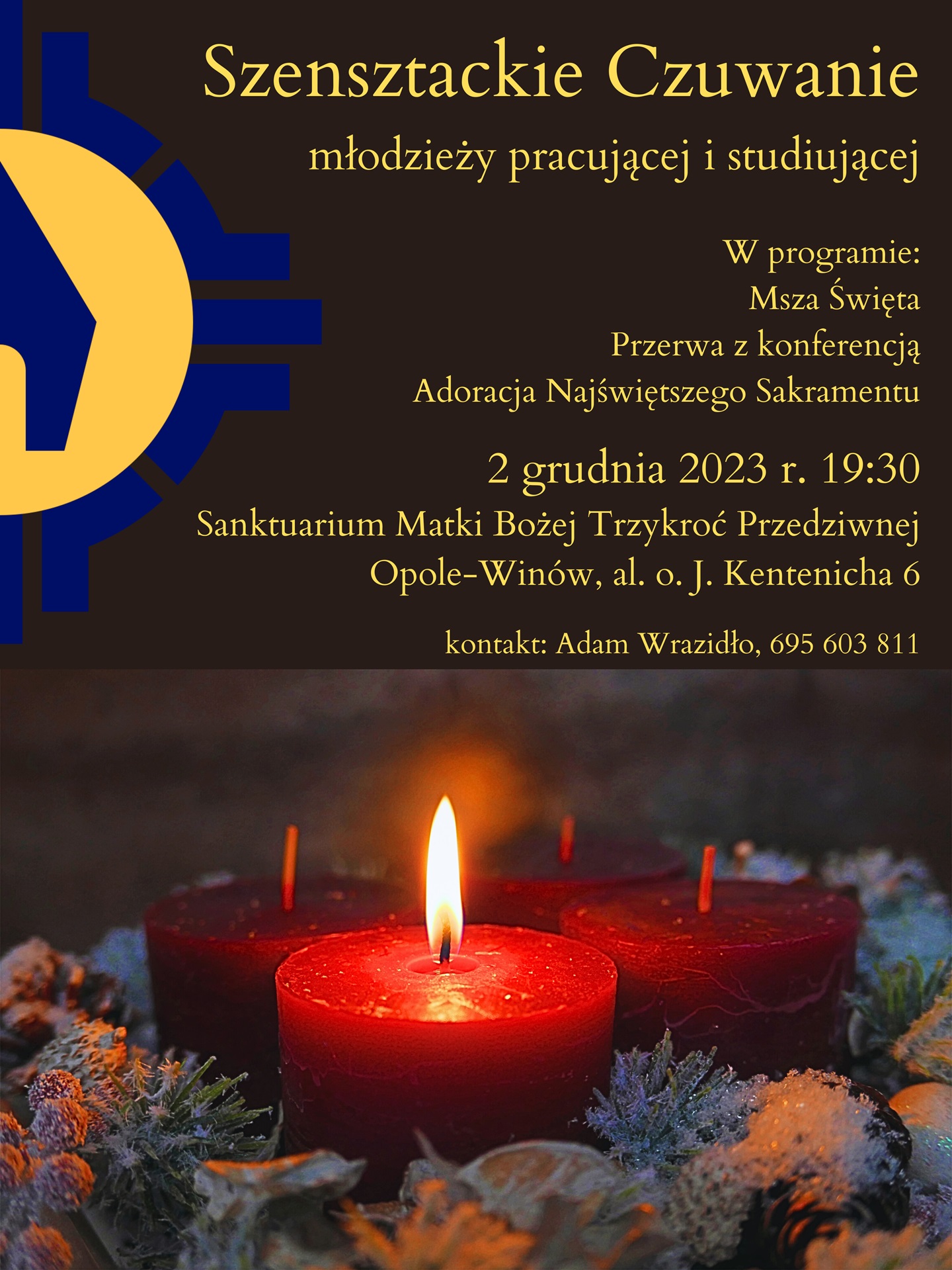 Młodzież Szensztacka wraz z s. Karoliną Dworczak ISSM zapraszają na szensztackie czuwanie dla młodzieży pracującej i studiującej, które odbędzie się w sobotę 2 grudnia 2023 r. o godz. 19.30 w Sanktuarium Matki Bożej Trzykroć Przedziwnej w Opolu-Winowie (al. o. J. Kentenicha 6). W programie: Msza św., przerwa, konferencja, adoracja Najświętszego Sakramentu. Więcej informacji: Adam Wrazidło – tel. 695 603 811.