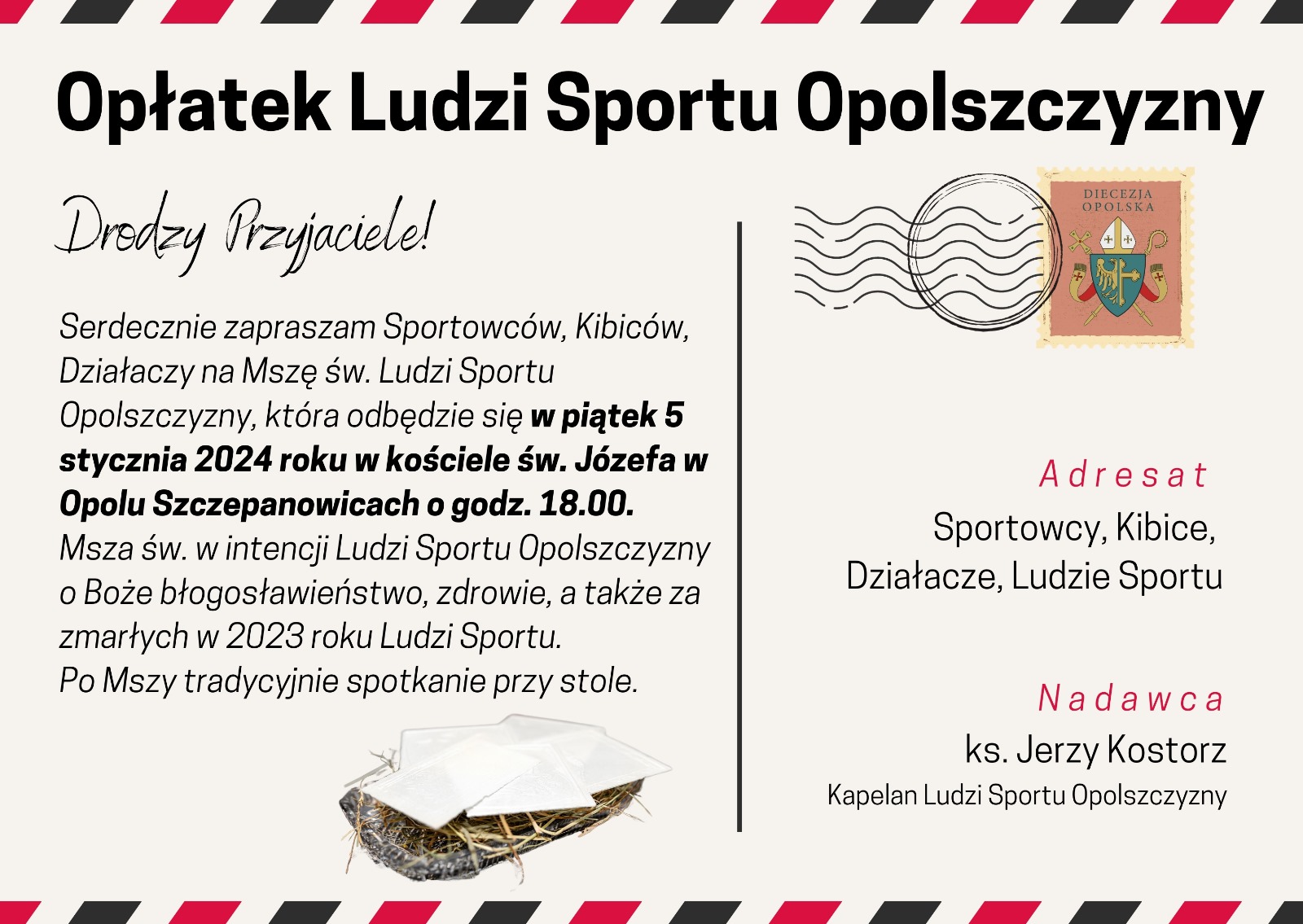 Ks. Jerzy Kostorz, diecezjalny duszpasterz ds. kultury zdrowotnej i sportu, bardzo serdecznie zaprasza sportowców, kibiców i działaczy sportowych z Opolszczyzny na Mszę św. sprawowaną w ich intencji oraz za zmarłych w 2023 r. ludzi sportu, która odbędzie się w piątek 5 stycznia 2024 r. o godz. 18.00 w kościele pw. św. Józefa w Opolu-Szczepanowicach. Po niej spotkanie przy stole.