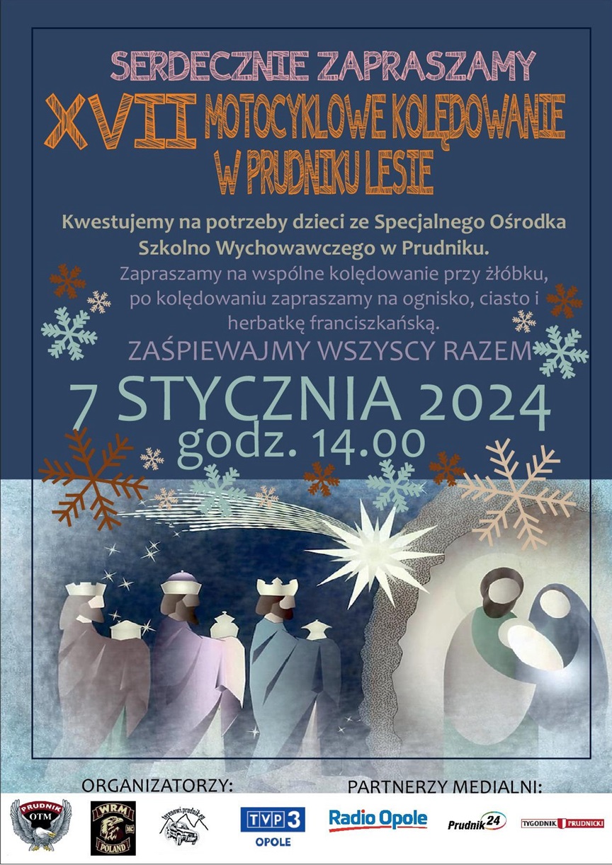 Ojcowie Franciszkanie zapraszają na XVII Motocyklowe kolędowanie przy żłóbku, które odbędzie się w niedzielę 7 stycznia 2024 r. o godz. 14.00 w Sanktuarium Świętego Józefa w Prudniku-Lesie. Po kolędowaniu organizatorzy zapraszają na ognisko, ciasto i franciszkańską herbatę. W czasie kolędowania odbędzie się zbiórka na potrzeby dzieci ze Specjalnego Ośrodka Szkolno-Wychowawczego w Prudniku.