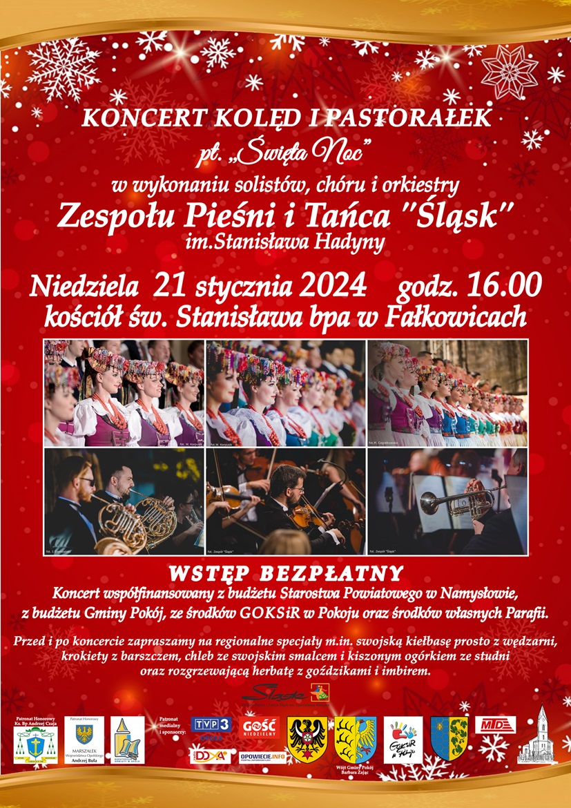 Ks. Mariusz Stafa, proboszcz parafii św. Stanisława biskupa w Fałkowicach, serdecznie zaprasza na koncert kolęd i pastorałek pt. ,,Święta Noc” w wykonaniu solistów, chóru i orkiestry Zespołu Pieśni i Tańca "Śląsk", który odbędzie się w niedzielę 21 stycznia 2024 r. o godz. 16.00 w kościele pw. św. Stanisława biskupa w Fałkowicach. Wstęp na koncert jest bezpłatny. Organizatorzy przed i po koncercie zapraszają na regionalne specjały.