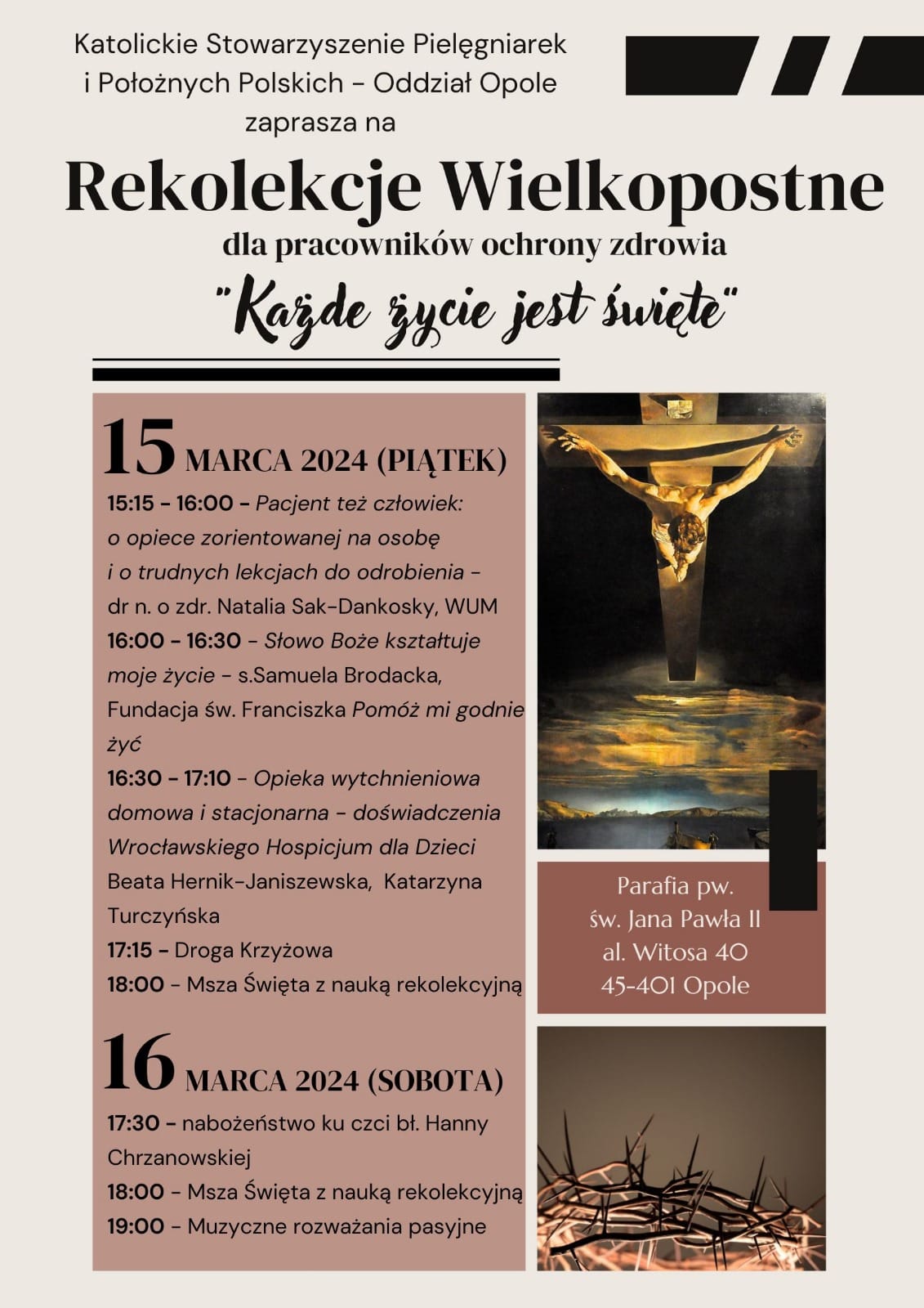 Katolickie Stowarzyszenie Pielęgniarek i Położnych Polskich - Oddział Opole zaprasza na rekolekcje wielkopostne dla pracowników ochrony zdrowia, które odbędą się 15 i 16 marca br. (piątek i sobota) w parafii św. Jana Pawła II w Opolu (al. Witosa 40). Towarzyszyć im będzie motto: "Każde życie jest święte".