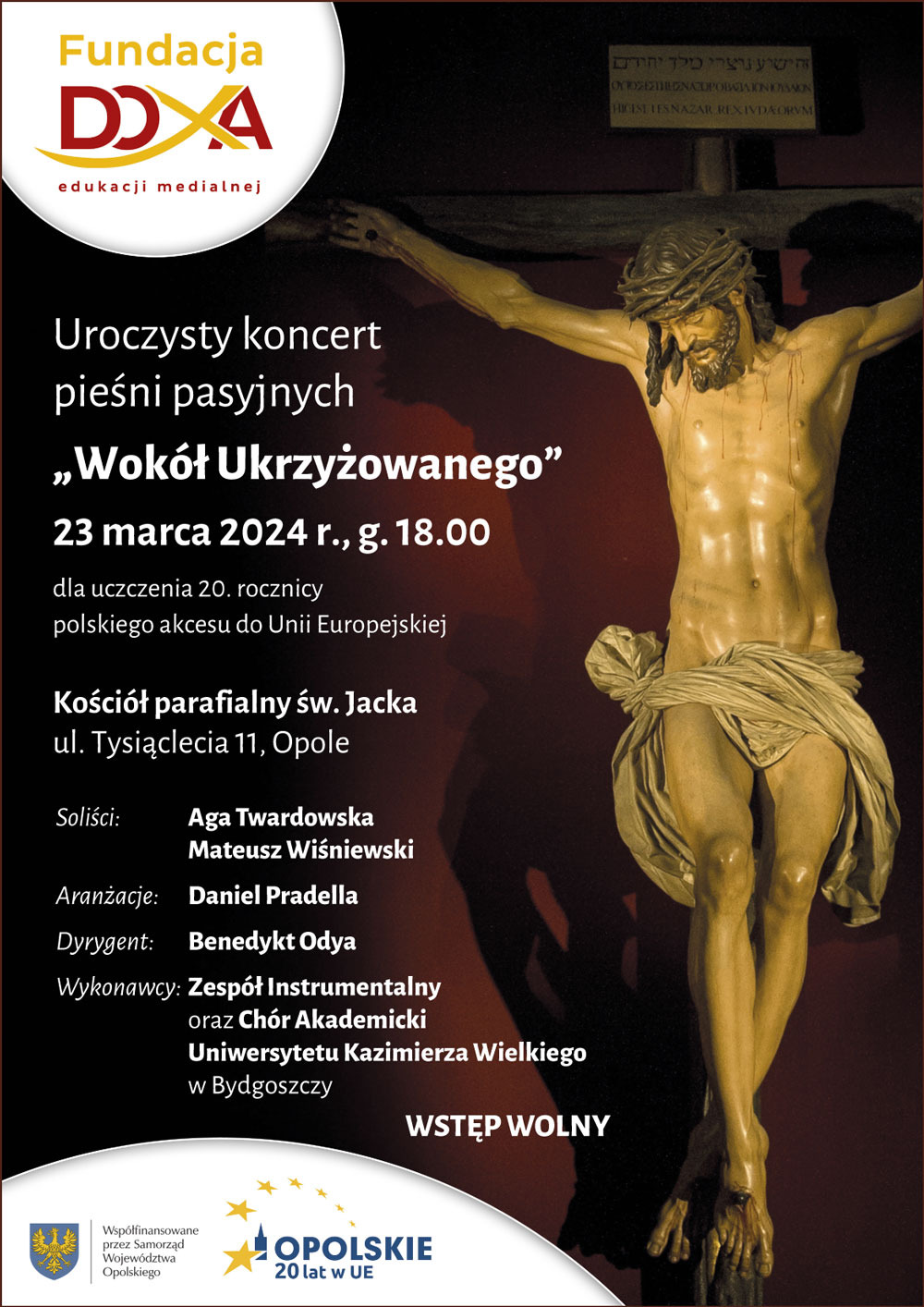 Diecezjalne Radio Doxa zaprasza na wyjątkowy koncert. W sobotę 23 marca br. o godz. 18.00 w kościele pw. św. Jacka w Opolu-Kolonii Gosławickiej zabrzmią pieśni pasyjne w wykonaniu Zespołu Instrumentalnego oraz Chóru Akademickiego Uniwersytetu Kazimierza Wielkiego w Bydgoszczy. Organizatorem koncertu jest Fundacja DOXA Edukacji Medialnej w ramach dofinansowania zadania pn.: "Harmonia Męki i Nadziei. Koncert pasyjny z okazji XX-lecia Polski w UE" ze środków Samorządu Województwa Opolskiego. Wstęp na koncert jest bezpłatny, będzie on również transmitowany na antenie Diecezjalnego Radia Doxa.