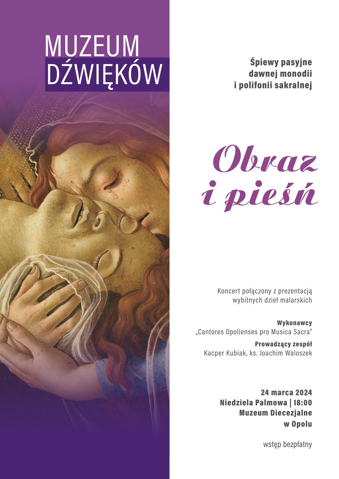 Ks. Wojciech Lippa, dyrektor Muzeum Diecezjalnego w Opolu, zaprasza na koncert połączony z prezentacją wybitnych dzieł malarskich, który odbędzie się w niedzielę 24 marca br. o godz. 18.00 w naszym diecezjalnym muzeum (ul. Kard. Kominka 1a – wejście od ul. Książąt Opolskich). Śpiewy pasyjne dawnej monodii i polifonii sakralnej wykona kameralny zespół wokalny „Cantores Opolienses pro Musica Sacra”, działający przy Wydziale Teologicznym UO, przygotowany przez ks. Joachima Waloszka i p. Kacpra Kubiaka.