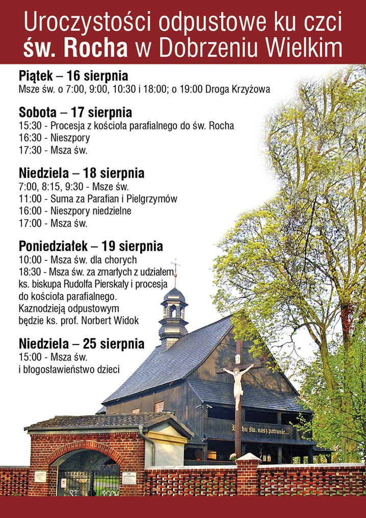 Ks. Jan Polok, proboszcz parafii św. Katarzyny Aleksandryjskiej w Dobrzeniu Wielkim, zaprasza w dniach 16-19 sierpnia br. na uroczystości odpustowe ku czci św. Rocha w Dobrzeniu Wielkim.