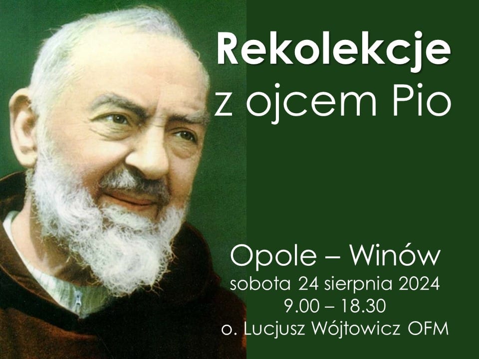 Grupa Modlitwy Ojca Pio zaprasza na rekolekcje, które odbędą się w sobotę 24 sierpnia br. w kościele pw. Ducha Świętego w Opolu-Winowie. Nauki wokół tematu „Żyć Eucharystią” wygłosi o. dr Lucjusz Wójtowicz OFM. Rozpoczęcie o godz. 9.00, a zakończenie Mszą św. o godz. 17.30. W programie: Msza św., konferencje formacyjne, okazja do spowiedzi i adoracji Krzyża, modlitwa różańcowa, nabożeństwo ku czci św. Ojca Pio, Koronka do Bożego Miłosierdzia, czas na dyskusję i spotkanie przy stole. Zapisy i szczegółowe informacje na furcie klasztornej oo. Franciszkanów w Opolu.