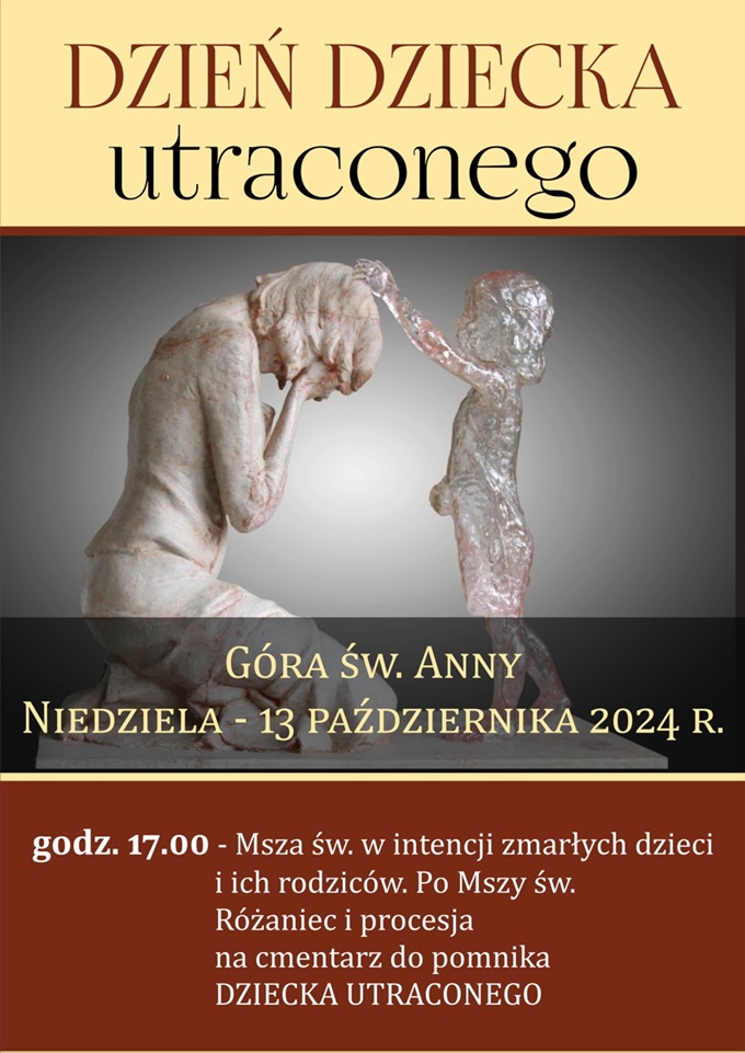 Ojcowie Franciszkanie z Góry Świętej Anny zapraszają na Mszę św. w intencji zmarłych przedwcześnie dzieci oraz za ich rodziców, która odbędzie się w niedzielę 13 października 2024 r. o godz. 17.00 w bazylice. Po Mszy św. modlitwa różańcowa i przejście na cmentarz do pomnika Dziecka Utraconego.