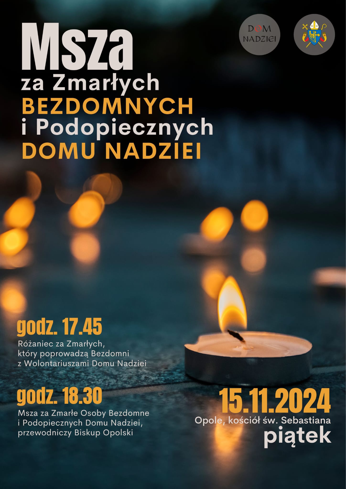 S. Aldona Skrzypiec SSpS, jałmużnik biskupa opolskiego, bardzo serdecznie zaprasza na Mszę świętą sprawowaną za zmarłe osoby bezdomne oraz podopiecznych Domu Nadziei, która odbędzie się w piątek 15 listopada 2024 r. o godz. 18.30 w kościele pw. św. Sebastiana w Opolu. Eucharystię poprzedzi modlitwa różańcowa o godz. 17.45, którą poprowadzą bezdomni i wolontariusze Domu Nadziei.