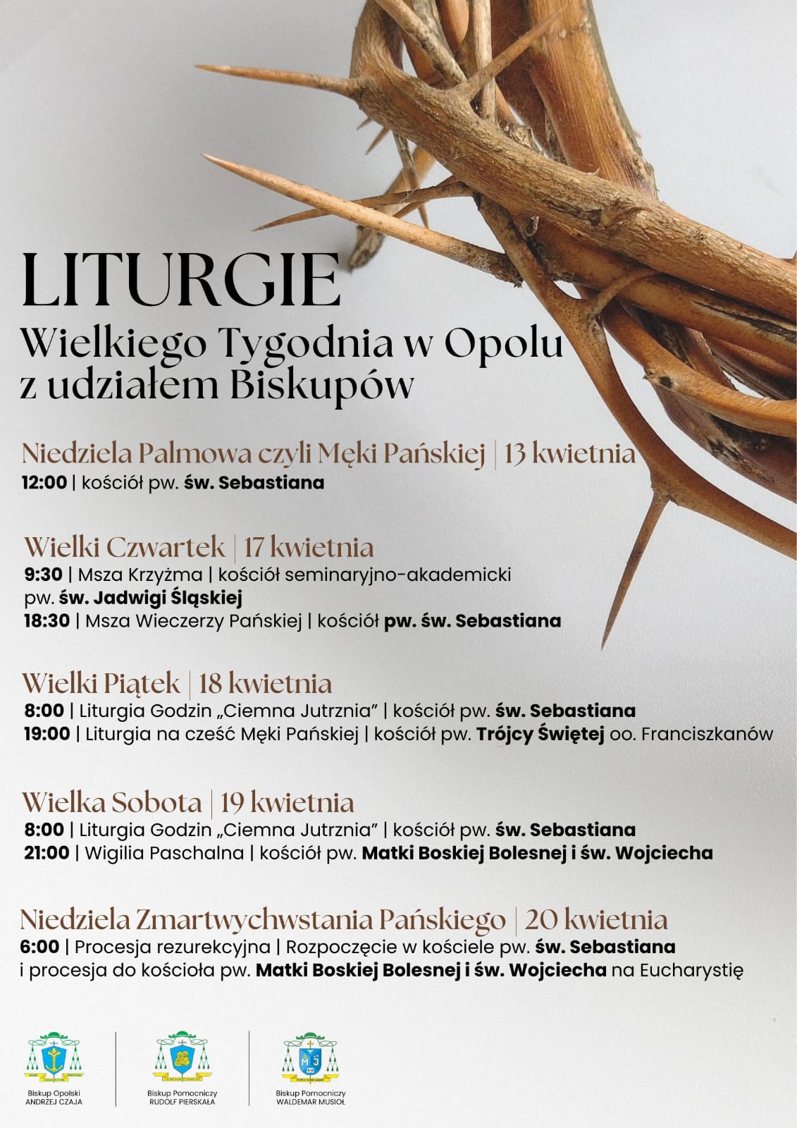 Tegoroczne celebracje Wielkiego Tygodnia pod przewodnictwem Biskupów, z uwagi na prace prowadzone w opolskiej katedrze, będą sprawowane w kościele seminaryjno-akademickim pw. św. Jadwigi Śląskiej, w kościele rektorskim pw. św. Sebastiana, w kościele parafialnym pw. Matki Bożej Bolesnej i św. Wojciecha oraz w kościele Ojców Franciszkanów w Opolu.