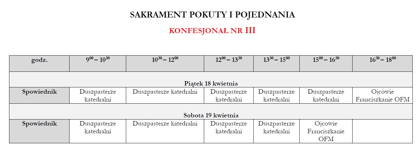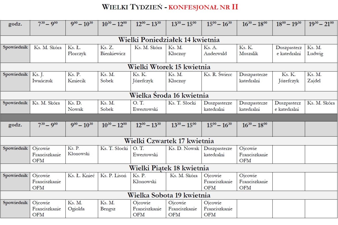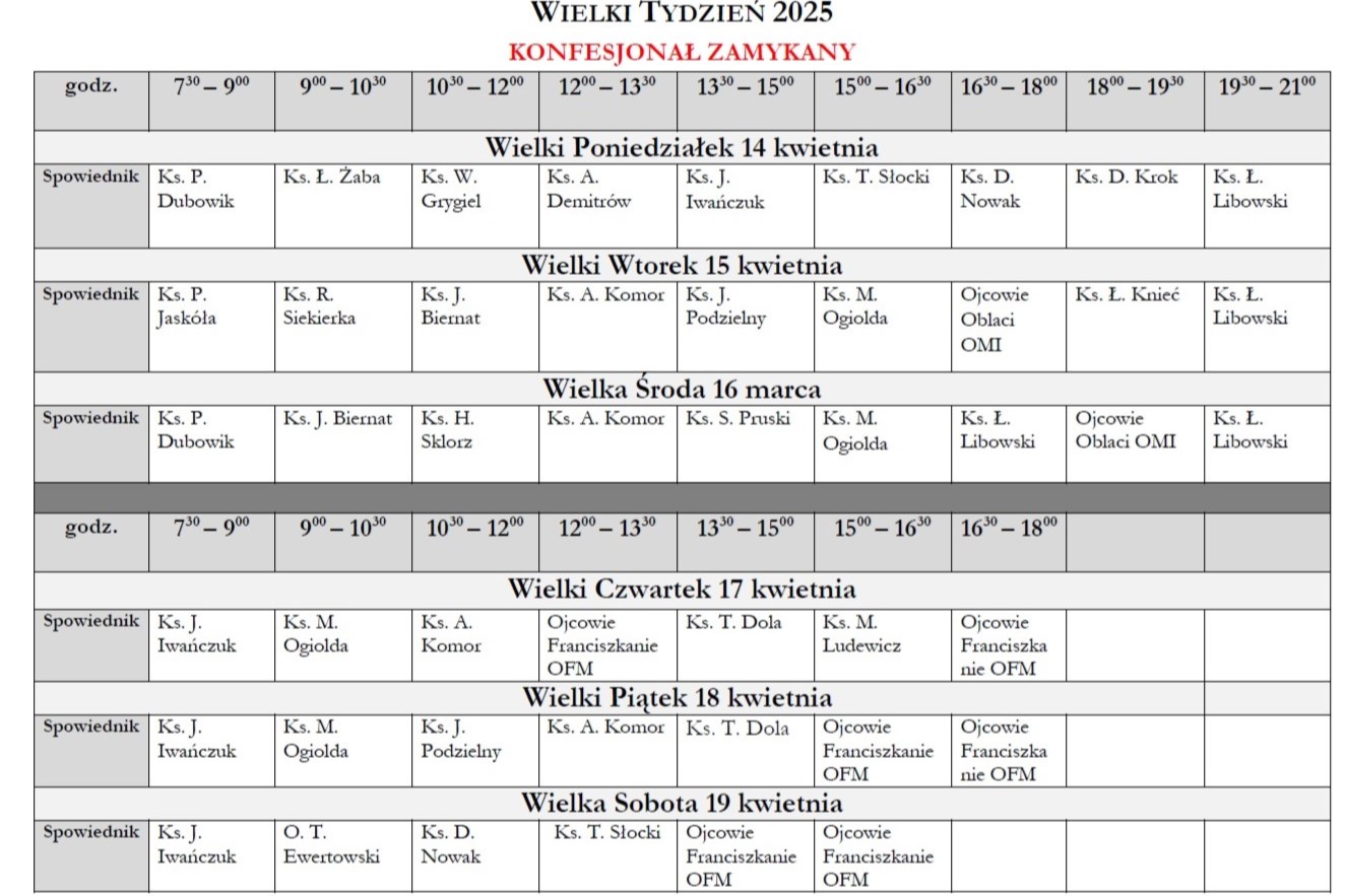 Przed uroczystością Zmartwychwstania Pańskiego zachęcamy do skorzystania z sakramentu pokuty i pojednania w „stałym” konfesjonale w kościele Ojców Franciszkanów w Opolu. W tym czasie kapłani będą posługiwać według poniższego harmonogramu, aby każdy mógł odpowiednio przygotować się duchowo do pełnego przeżywania Świąt.