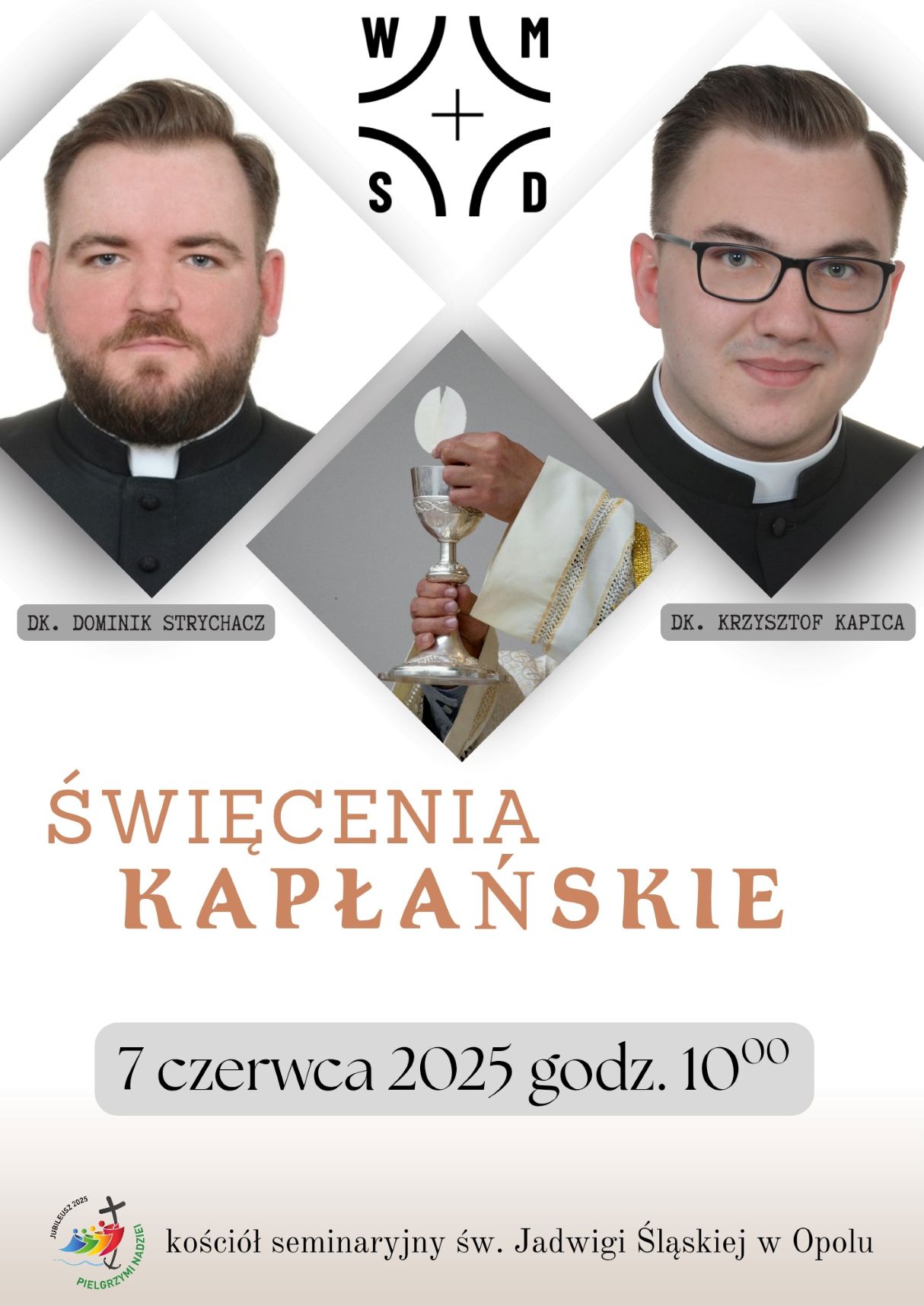 Ks. Robert Sadlak, wicerektor Wyższego Międzydiecezjalnego Seminarium Duchownego w Opolu, informuje, że w sobotę 7 czerwca 2025 r. w kościele seminaryjno-akademickim w Opolu, podczas Mszy św. o godz. 10.00, święcenia kapłańskie otrzyma dwóch diakonów: dk. Krzysztof Kapica z parafii Narodzenia NMP w Kościeliskach (dekanat gorzowski) oraz dk. Dominik Strychacz z parafii NSPJ w Walawie (archidiecezja przemyska). Wspólnota WMSD zaprasza wszystkich Księży do koncelebrowania Eucharystii. Wdzięczni Panu Bogu za ich dar, upraszajmy dla nich potrzebne łaski, aby byli wiernymi szafarzami Bożych tajemnic, radosnymi głosicielami Ewangelii i prowadzili wyznawców Chrystusa Jego drogą. Zgodnie z postanowieniami synodalnymi (statut 135), w dniu święceń o godz. 11.00 powinny zabrzmieć w naszych świątyniach dzwony, przypominające wiernym o tym wydarzeniu.
