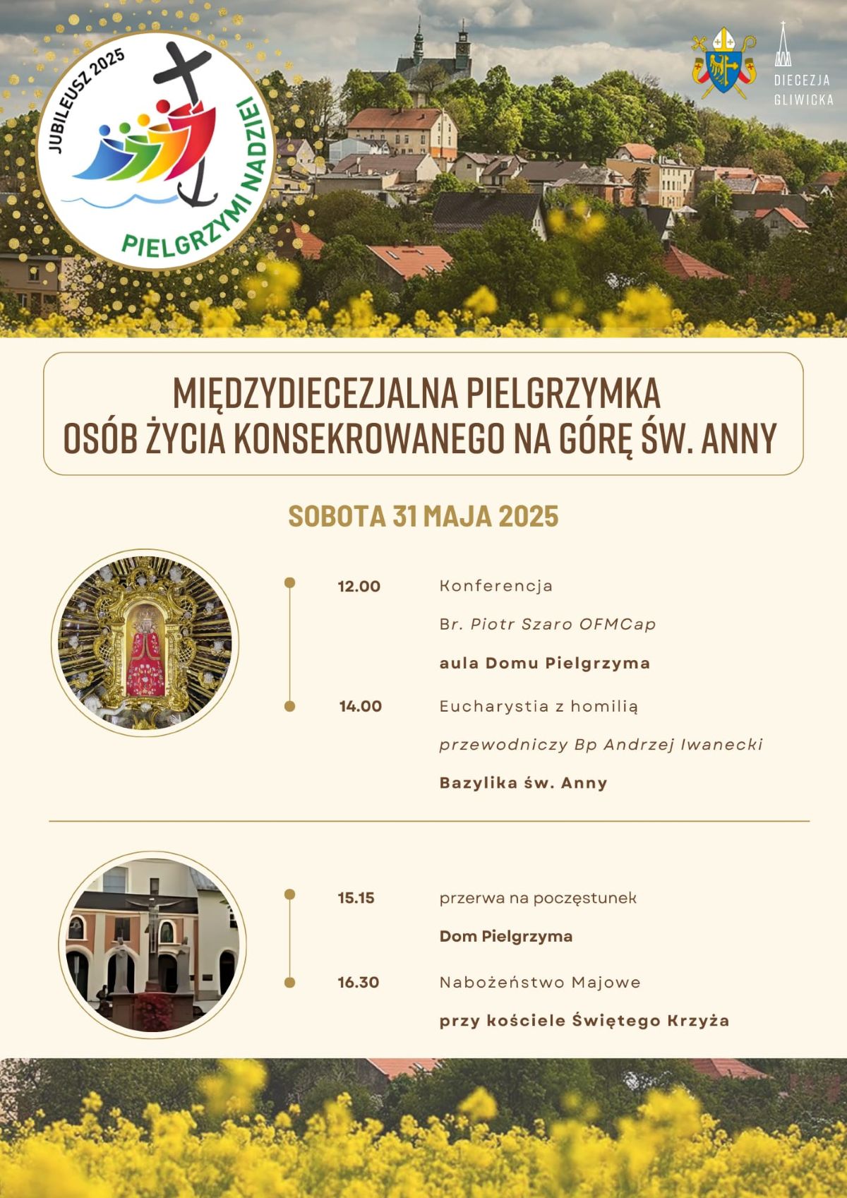 Siostra Jolanta Radomyska SSpS, referentka sióstr zakonnych, i o. Błażej Kurowski OFM, wikariusz biskupi ds. życia konsekrowanego, bardzo serdecznie zapraszają wszystkie osoby konsekrowane naszej diecezji do udziału w Międzydiecezjalnej Pielgrzymce Osób Życia Konsekrowanego, która odbędzie się w sobotę 31 maja br. na Górze Świętej Anny.