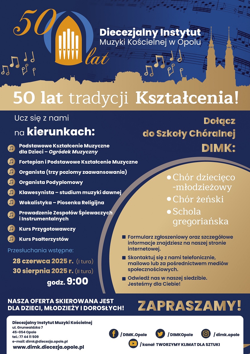 Diecezjalny Instytut Muzyki Kościelnej zaprasza kandydatów do nauki. Przesłuchania wstępne na rok szkolny 2025/2026 odbędą się w sobotę 28 czerwca oraz w sobotę 30 sierpnia br. o godz. 9.00.