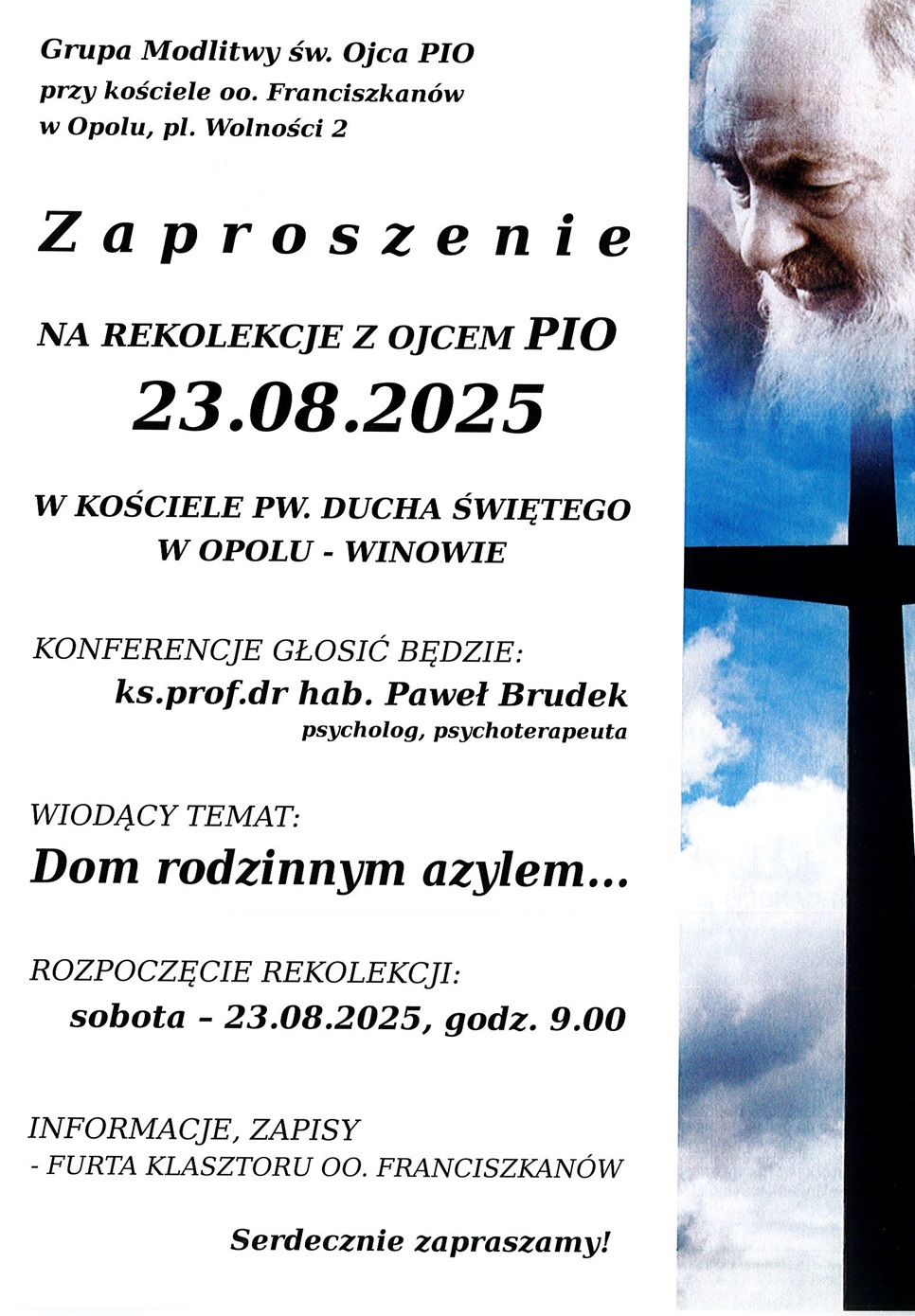 Grupa Modlitwy Ojca Pio zaprasza na rekolekcje, które odbędą się w sobotę 23 sierpnia br. w kościele pw. Ducha Świętego w Opolu-Winowie. Nauki wokół tematu „Dom rodzinnym azylem” wygłosi ks. prof. Paweł Brudek, psycholog i psychoterapeuta.