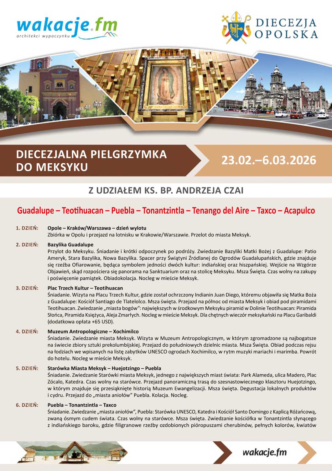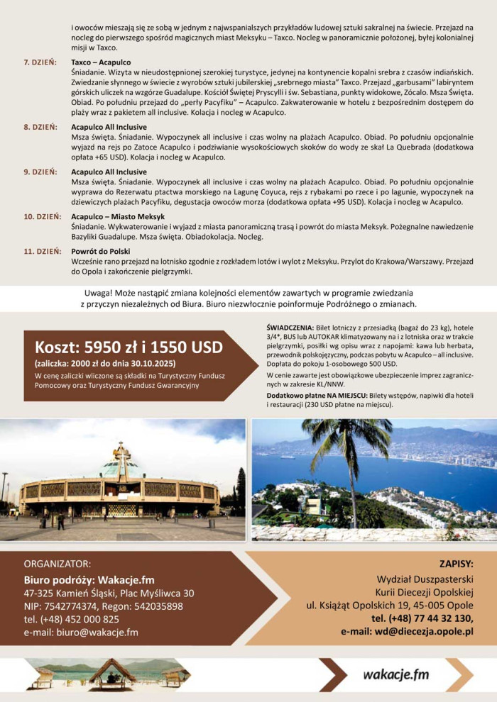 Na trasie jedenastodniowej pielgrzymi znajdują się następujące miejsca: Guadalupe, Teotihuacan, Puebla, Tonantzintla, Tenango del Aire, Taxco i Acapulco. Koszt: 5950 zł i 1550 USD (zaliczka 2000 zł do 30 października br.) oraz 230 USD płatne u pilota (bilety wstępów, napiwki dla hoteli i restauracji itp.). Zapisy w Wydziale Duszpasterskim Kurii Diecezji Opolskiej (osobiście, telefonicznie 77 44 32 130 lub mailowo Ten adres pocztowy jest chroniony przed spamowaniem. Aby go zobaczyć, konieczne jest włączenie w przeglądarce obsługi JavaScript.).