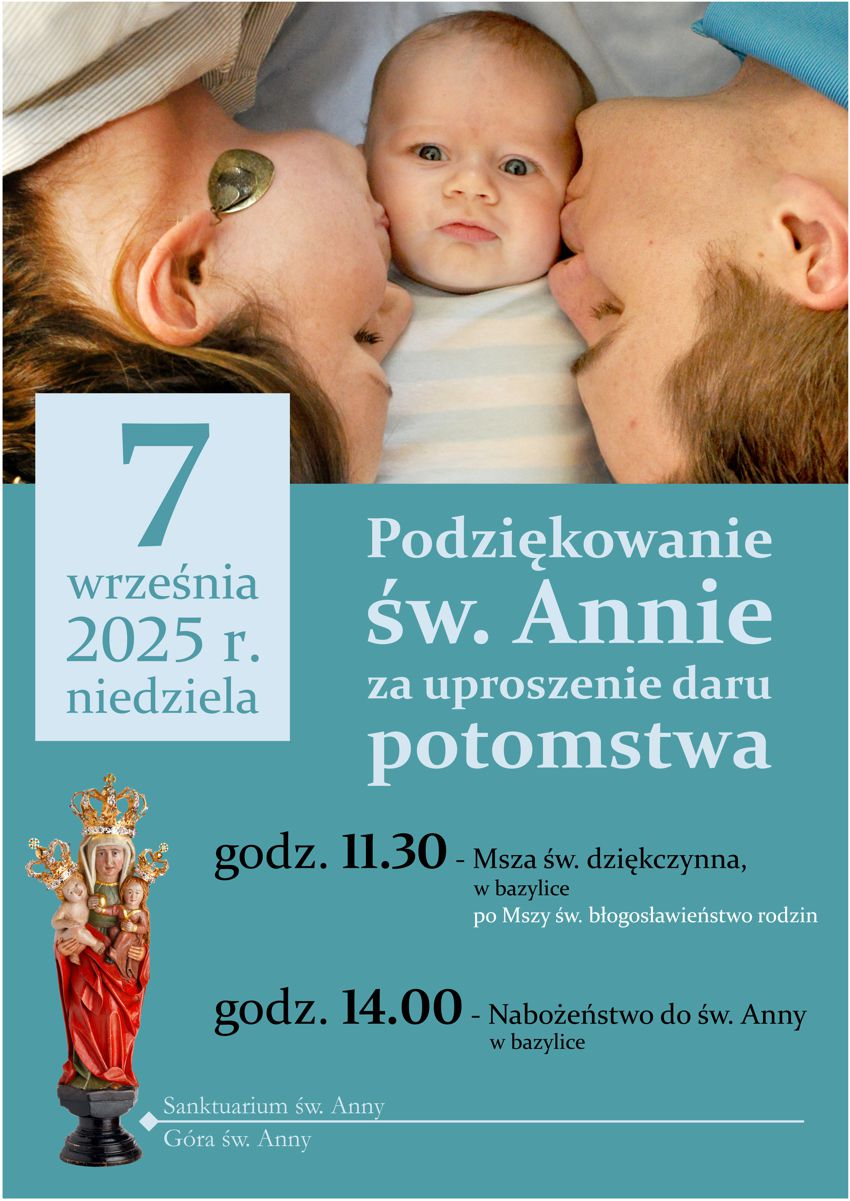 W niedzielę, 7 września, o godz. 11.30, w Bazylice św. Anny na Górze Świętej Anny będzie sprawowana Msza św. dziękczynna za dar potomstwa otrzymany za wstawiennictwem św. Anny.