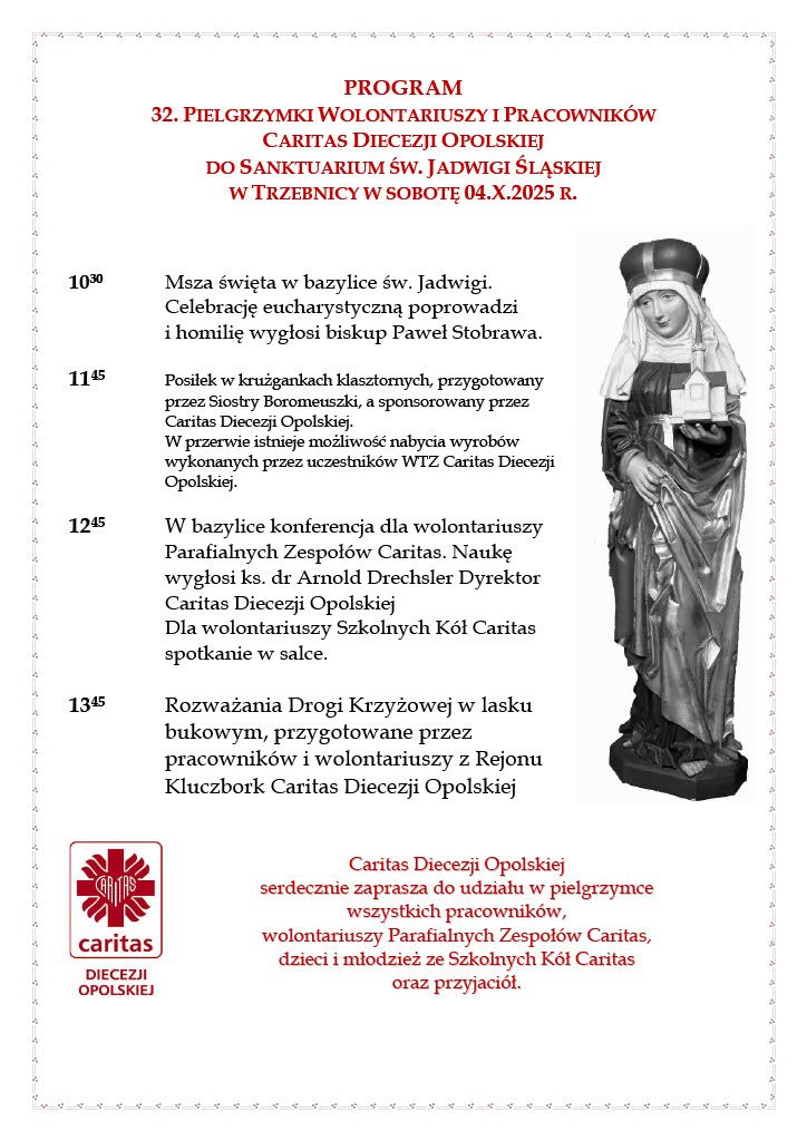 Caritas Diecezji Opolskiej zaprasza wszystkich wolontariuszy Parafialnych Zespołów Caritas, pracowników i przyjaciół oraz dzieci i młodzież ze Szkolnych Kół Caritas do udziału w 32. Pielgrzymce Caritas Diecezji Opolskiej do grobu św. Jadwigi Śląskiej w Trzebnicy, która odbędzie się w sobotę, 4 października.
