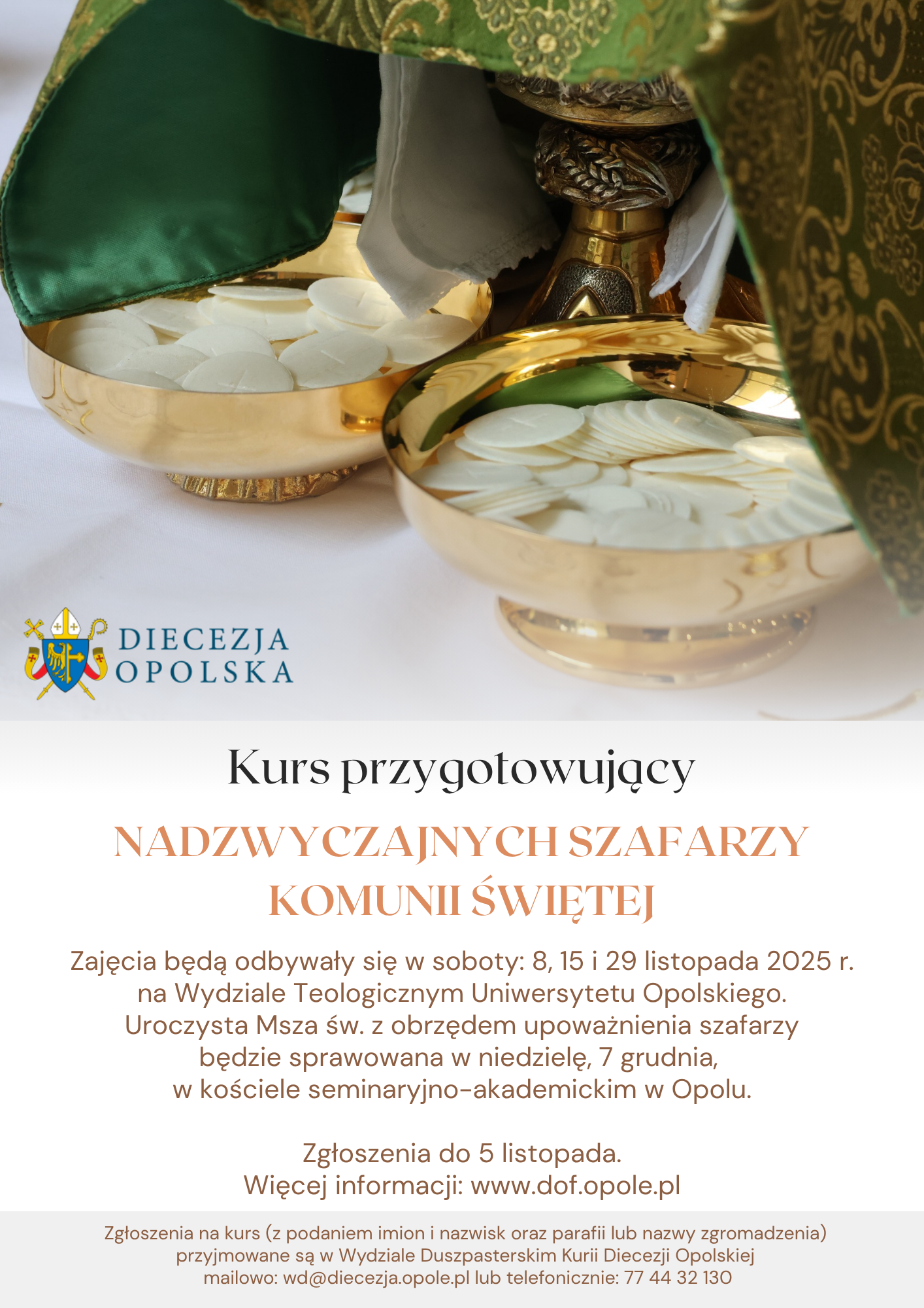 Do 5 listopada Wydział Duszpasterski Kurii Diecezji Opolskiej przyjmuje zgłoszenia kandydatów na kurs przygotowujący nadzwyczajnych szafarzy Komunii Świętej. Zajęcia będą odbywały się w trzy soboty: 8, 15 i 29 listopada na Wydziale Teologicznym Uniwersytetu Opolskiego. Uroczysta Eucharystia z obrzędem upoważnienia szafarzy będzie sprawowana w niedzielę, 7 grudnia, w kościele seminaryjno-akademickim w Opolu.
