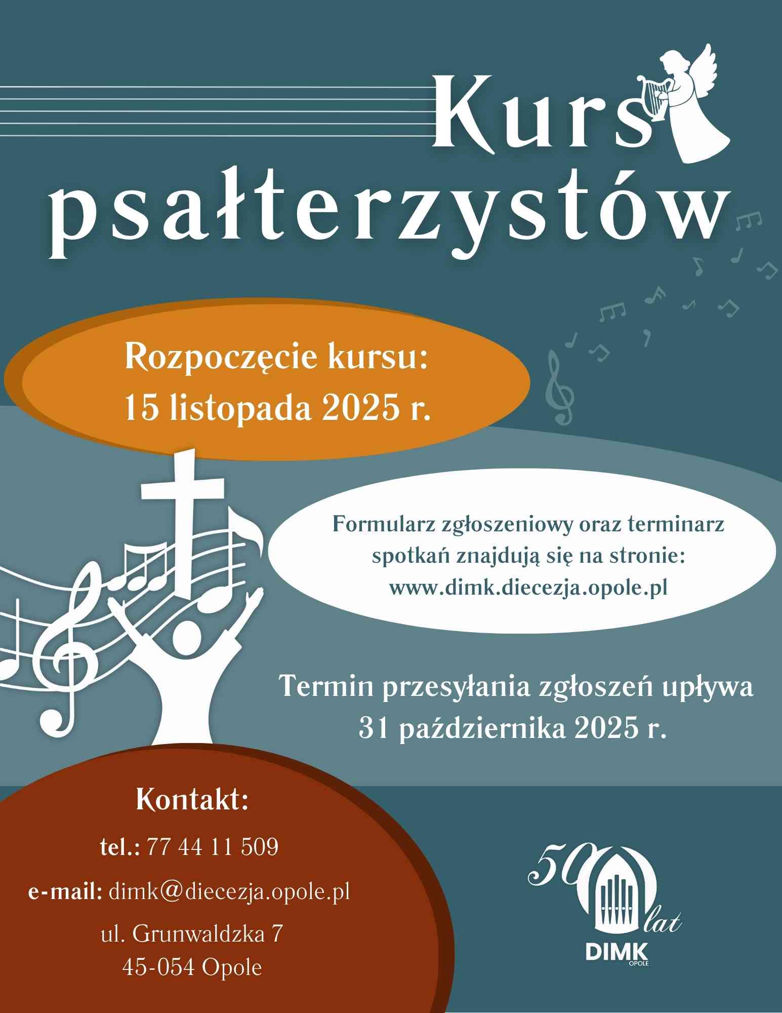 Diecezjalny Instytut Muzyki Kościelnej w Opolu zaprasza do udziału w Kursie Psałterzystów, którego celem jest kompetentne przygotowanie muzyczne oraz formacja osób wykonujących psalmy responsoryjne w ramach liturgii.