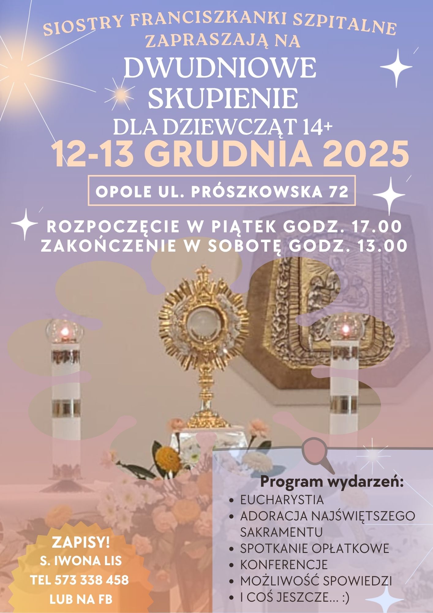 Siostry Franciszkanki Szpitalne zapraszają dziewczęta (od lat 14) na dwudniowe skupienie, które odbędzie się w dniach 12-13 grudnia w klasztorze sióstr w Opolu (ul. Prószkowska 72).