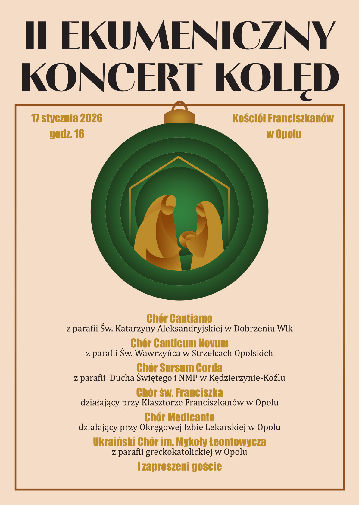 W sobotę 17 stycznia 2026 r. o godz. 16.00 w kościele Ojców Franciszkanów w Opolu odbędzie się II Ekumeniczny Koncert Kolęd, podczas którego wystąpią m.in. Chór Cantiamo z parafii św. Katarzyny Aleksandryjskiej w Dobrzeniu Wielkim, Chór Canticum Novum z parafii św. Wawrzyńca w Strzelcach Opolskich i Chór Sursum Corda z parafii Ducha Świętego i NMP Matki Kościoła w Kędzierzynie-Koźlu (Piasty).