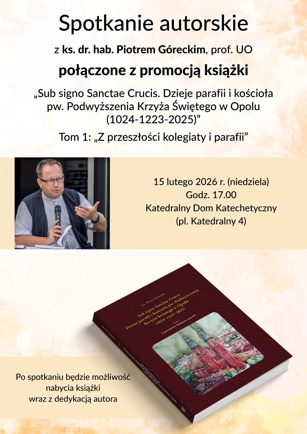 Ks. Waldemar Klinger, proboszcz parafii Podwyższenia Krzyża Świętego w Opolu, zaprasza na spotkanie autorskie z ks. Piotrem Góreckim i promocję książki „Sub signo Sanctae Crucis. Dzieje parafii i kościoła pw. Podwyższenia Krzyża Świętego w Opolu (1024-1223-2025)”, które odbędzie się w niedzielę 15 lutego 2026 r. o godz. 17.00 w Katedralnym Domu Katechetycznym (pl. Katedralny 4). Po spotkaniu będzie możliwość nabycia książki z dedykacją autora.