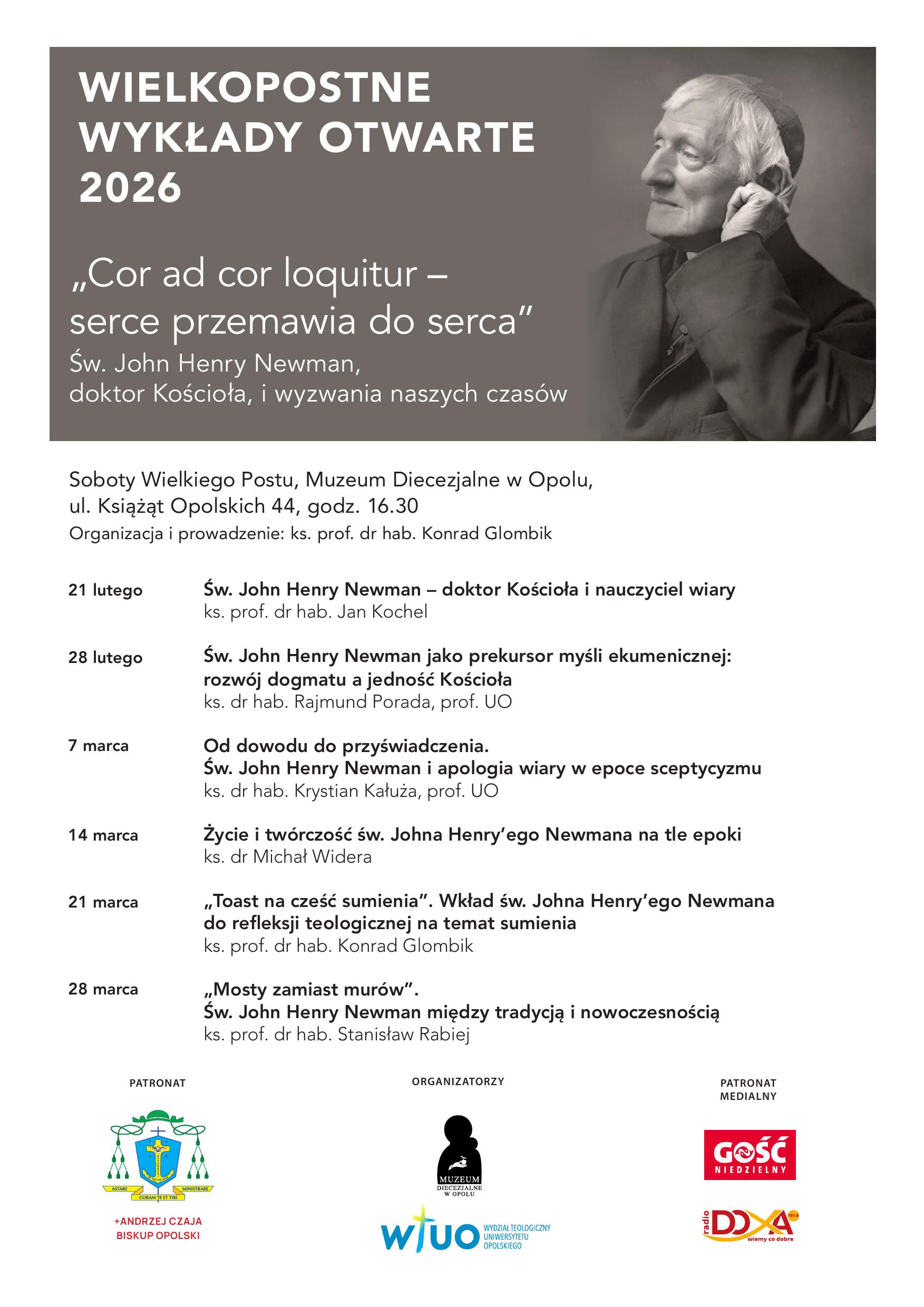 Cykl organizuje i prowadzi ks. prof. dr hab. Konrad Glombik. W gronie prelegentów znajdą się pracownicy naukowo-dydaktyczni Wydziału Teologicznego Uniwersytetu Opolskiego, którzy podejmą m.in. zagadnienia rozwoju dogmatu, ekumenizmu, sumienia, relacji między tradycją a nowoczesnością oraz aktualności myśli św. Johna Henry’ego Newmana.