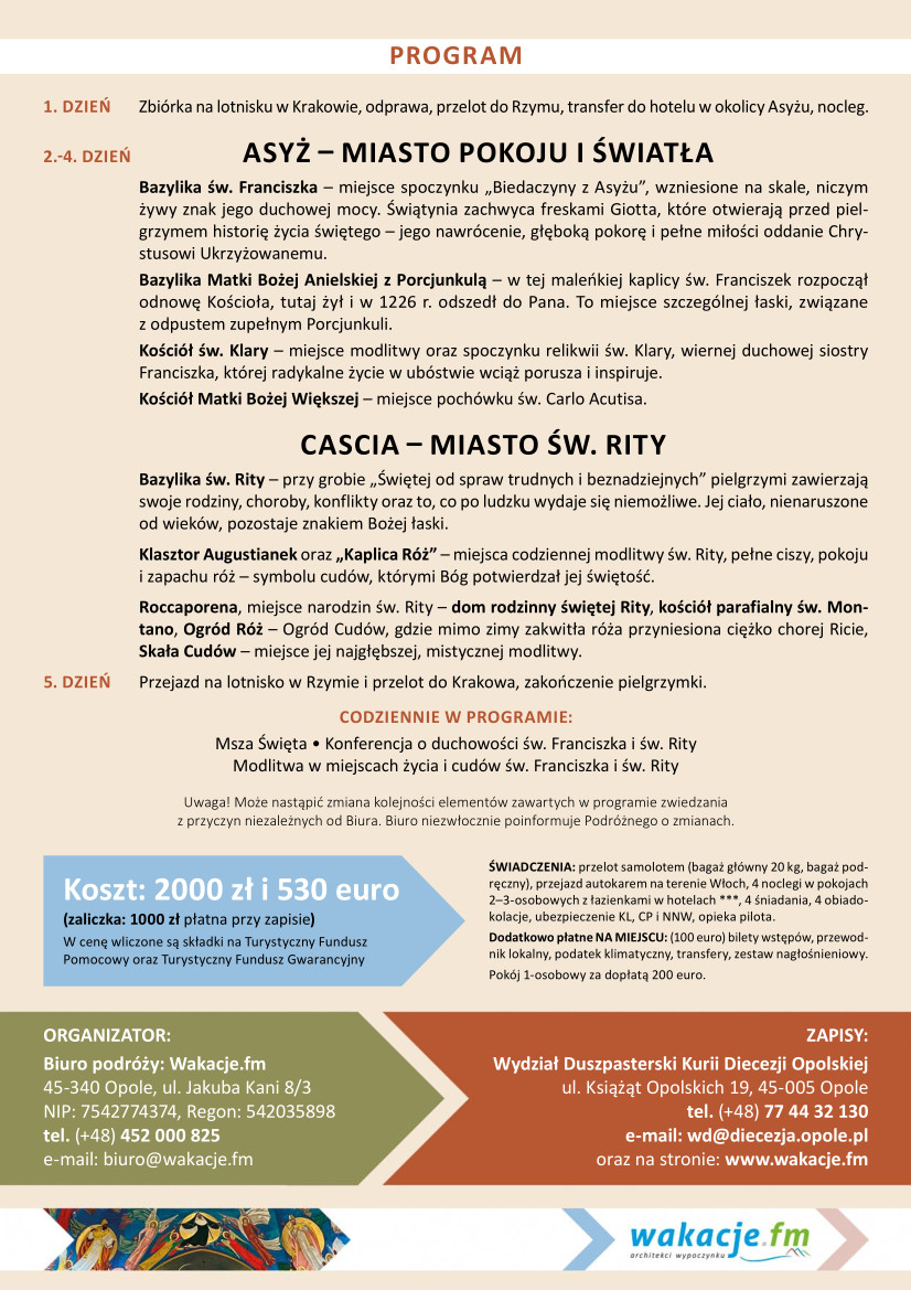 Pielgrzymom towarzyszyć będą biskupi naszej diecezji. Na trasie pięciodniowej pielgrzymki znajdują się następujące miejsca: Asyż (bazylika pw. św. Franciszka, bazylika pw. Matki Bożej Anielskiej, kościół pw. św. Klary, kościół pw. Matki Bożej Większej), Cascia (bazylika pw. św. Rity, klasztor Augustianek oraz „Kaplica Róż”),  Roccaporena (dom rodzinny świętej Rity, kościół parafialny pw. św. Montano, Ogród Róż i Skała Cudów). Każdego dnia zaplanowana jest Msza św. z homilią, konferencja o duchowości św. Franciszka i św. Rity, a także wspólna modlitwa w miejscach życia i cudów św. Franciszka i św. Rity. Pielgrzymka przyjmie formę rekolekcji, także dla kapłanów. Koszt: 2000 zł i 530 Euro (zaliczka 1000 zł przy zapisie) oraz 100 Euro płatne u pilota (bilety wstępów, przewodnik lokalny, podatek klimatyczny, transfery, zestaw nagłośnieniowy. itp.). Zapisy w Wydziale Duszpasterskim Kurii Diecezji Opolskiej (osobiście, telefonicznie 77 44 32 130 lub mailowo Ten adres pocztowy jest chroniony przed spamowaniem. Aby go zobaczyć, konieczne jest włączenie w przeglądarce obsługi JavaScript.) lub na stronie: www.wakacje.fm. Szczegółowe informacje u organizatora - w Biurze Podróży Wakacje.fm (tel. +48 452 000 825 lub e-mailowo: Ten adres pocztowy jest chroniony przed spamowaniem. Aby go zobaczyć, konieczne jest włączenie w przeglądarce obsługi JavaScript.).
