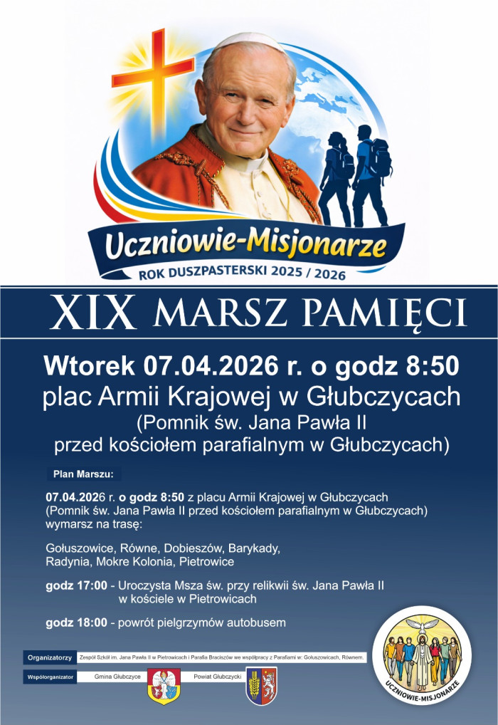 Zespół Szkół w Pietrowicach Głubczyckich i Parafia św. Jana Nepomucena w Braciszowie serdecznie zapraszają do udziału w „XIX Marszu Pamięci”, który odbędzie się we wtorek 7 kwietnia. Tegoroczny Marsz Pamięci, obchodzony pod hasłem „Uczniowie-misjonarze”, w wyjątkowy sposób wpisuje się w duchowe dziedzictwo św. Jan Paweł II.