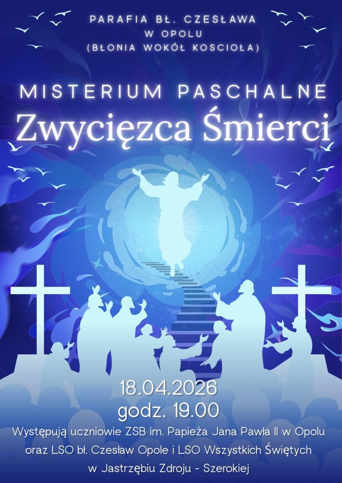 Duszpasterze parafii bł. Czesława w Opolu zapraszają na Misterium Paschalne pt. „Zwycięzca śmierci”, które odbędzie się w sobotę 18 kwietnia o godz. 19.00 na błoniach przy kościele pw. bł. Czesława w Opolu.