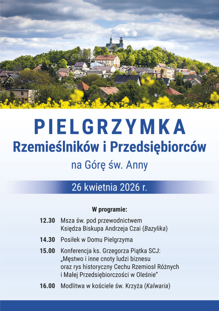 Diecezjalny duszpasterz Przedsiębiorców i Rzemieślników, ks. Krystian Muszalik, zaprasza na doroczną pielgrzymkę Przedsiębiorców i Rzemieślników, która odbędzie się w niedzielę 26 kwietnia na Górze św. Anny.