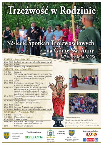 Duszpasterstwo Trzeźwościowe na Górze Świętej Anny zaprasza na 32. Spotkanie Trzeźwościowe, które odbędzie się w dniach 5-7 września br. Tegorocznym tematem spotkania jest „Rozwijanie relacji”.
