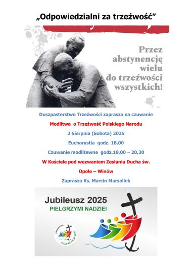 Diecezjalny duszpasterz trzeźwości, ks. Marcin Marsollek, zaprasza na diecezjalne czuwanie modlitewne o trzeźwość Polskiego Narodu i zadośćuczynienie za grzechy pijaństwa, które odbędzie się w sobotę 2 sierpnia br. w godzinach 18.00-20.30 w kościele pw. Ducha Świętego w Opolu-Winowie.