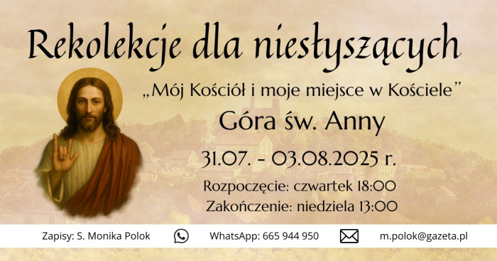 W dniach 31 lipca-3 sierpnia na Górze Świętej Anny odbędą się doroczne rekolekcje i pielgrzymka Osób Niesłyszących. Hasło tegorocznej pielgrzymki brzmi: „Mój Kościół i moje miejsce w Kościele”.