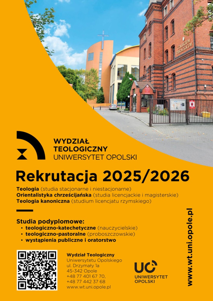 Wydział Teologiczny Uniwersytetu Opolskiego zaprasza do studiowania w ramach następujących kierunków: Teologia (moduł kapłański, 6-letnie studia magisterskie); Teologia (moduł katechetyczny, 5-letnie studia magisterskie); Teologia (moduł duchowość i kultura chrześcijańska - 5-letnie studia magisterskie, także w formie niestacjonarnej); Orientalistyka chrześcijańska (3-letnie studia licencjackie; 2-letnie studia magisterskie); Teologia kanoniczna (2-letnie studium licencjatu rzymskiego, przygotowujące do doktoratu).