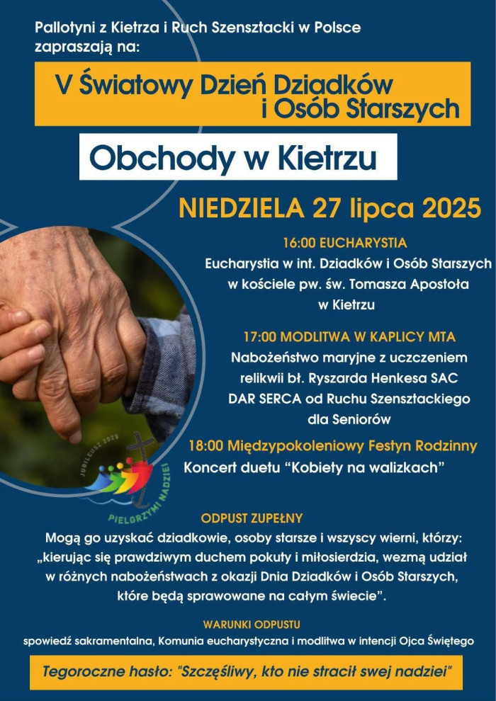 Księża Pallotyni z Kietrza oraz Ruch Szensztacki w Polsce zapraszają na obchody V Światowego Dnia Dziadków i Osób Starszych, które odbędą się w niedzielę 27 lipca br. w Kietrzu pod hasłem „Szczęśliwy, kto nie stracił swej nadziei”.
