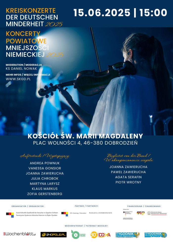 Towarzystwo Społeczno-Kulturalne Niemców na Śląsku Opolskim zaprasza na Koncert Uwielbienia, który odbędzie się w niedzielę 15 czerwca br. o godz. 15.00 w kościele parafialnym pw. św. Marii Magdaleny w Dobrodzieniu.