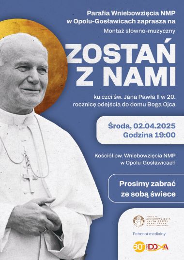 2 kwietnia br., w 20. rocznicę śmierci Jana Pawła II, o godz. 19.00 w kościele pw. Wniebowzięcia NMP w Opolu-Gosławicach odbędzie się montaż słowno-muzyczny pt. „Zostań z nami”. Montaż został podzielony na 13 części, z których każda ukazuje ważny moment z życia Papieża Polaka.