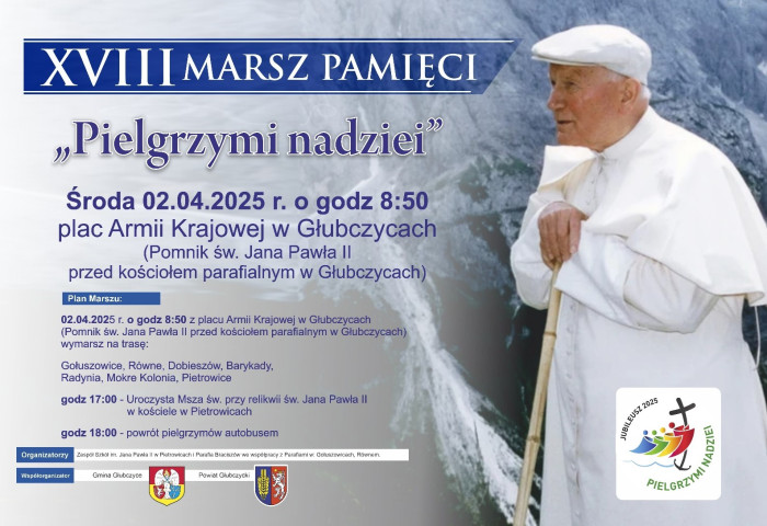 XVIII Marsz Pamięci pod hasłem „Pielgrzymi nadziei” odbędzie się w środę, 2 kwietnia br., w 20. rocznicę śmierci św. Jana Pawła II. Marsz rozpocznie się o godz. 8.50 przy pomniku św. Jana Pawła II, przed kościołem parafialnym w Głubczycach.