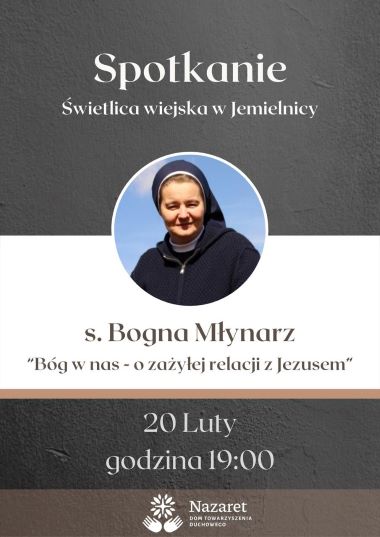 W czwartek, 20 lutego br., w Świetlicy Wiejskiej w Jemielnicy odbędzie się spotkanie formacyjne z s. Bogną Młynarz, doktorem teologii duchowości, należącej do Zgromadzenia Sióstr Najświętszej Duszy Chrystusa Pana.
