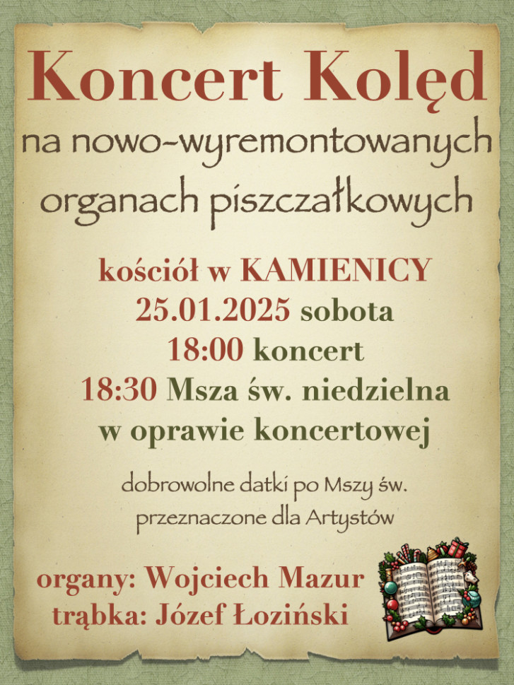 godz. 16.00 – Ekumeniczny Koncert Kolęd, kościół OO. Franciszkanów w Opolu (wystąpią: Chór Ave Verum z par. ap. Piotra i Pawła w Opolu, Chór Cantiamo z par. św. Katarzyny Aleksandryjskiej w Dobrzeniu Wielkim, Chór Canticum Novum z par. św. Wawrzyńca w Strzelcach Opolskich, Chór Sursum Corda z par. Ducha Świętego i NMP w Kędzierzynie–Koźlu, Chór św. Franciszka działający przy Klasztorze Franciszkanów w Opolu, Chór FeelinGospel działający przy Kościele Ostoja w Opolu, Ukraiński Chór im. Mykoły Łeontowycza z par. greckokatolickiej w Opolu)