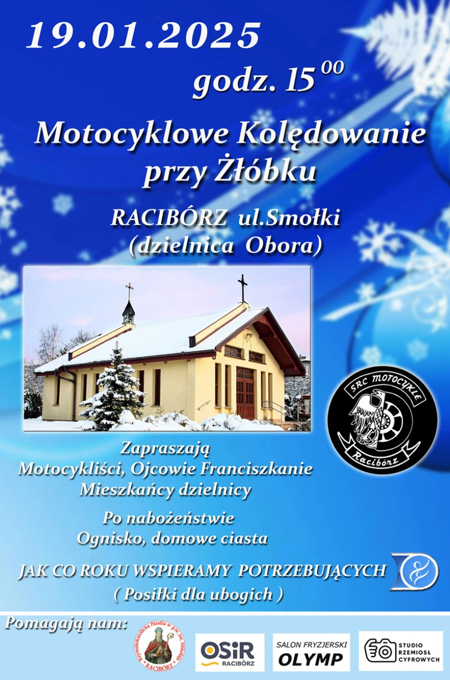 Ojcowie Franciszkanie, Motocykliści oraz Mieszkańcy raciborskiej dzielnicy Obora zapraszają na motocyklowe kolędowanie przy żłóbku, które odbędzie się w niedzielę, 19 stycznia br., o godz. 15:00 w kościele pw. Matki Bożej Anielskiej w Raciborzu-Oborze.