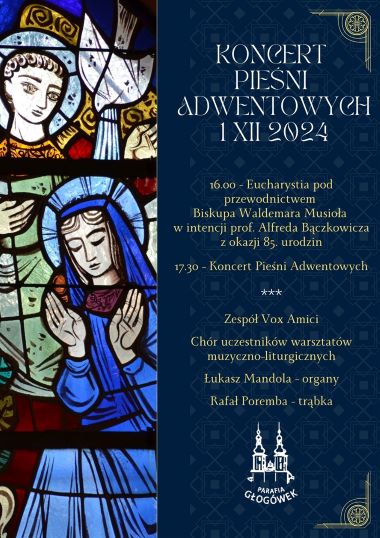Duszpasterze parafii św. Bartłomieja w Głogówku bardzo serdecznie zapraszają na koncert pieśni adwentowych, będący zwieńczeniem warsztatów muzyczno-liturgicznych, który odbędzie się w niedzielę 1 grudnia br. o godz. 17.30. Podczas koncertu wystąpi Zespół Vox Amici, Chór uczestników warsztatów muzyczno-liturgicznych, p. Łukasz Mandola (organy) oraz p. Rafał Poremba (trąbka). O godz. 16.00 odbędzie się Msza św. pod przewodnictwem biskupa Waldemara Musioła, sprawowana w intencji prof. Alfreda Bączkowicza, emerytowanego organisty opolskiej katedry, obchodzącego 85. rocznicę urodzin.