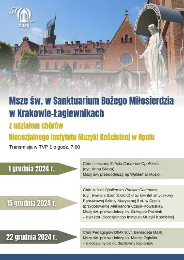 • 1 grudnia (przewodniczenie: bp Waldemar Musioł; oprawa muzyczna: Chór mieszany Diecezjalnego Instytutu Muzyki Kościelnej Schola Cantorum Opoliensis pod dyrekcją p. Anny Sikory);